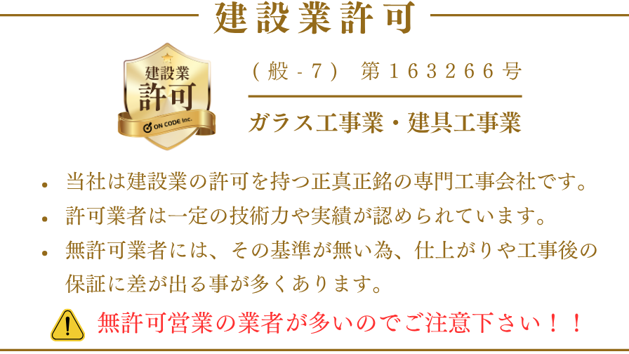 | 建設業許可 | 建設業の種類:ガラス工事業・建具工事業 |